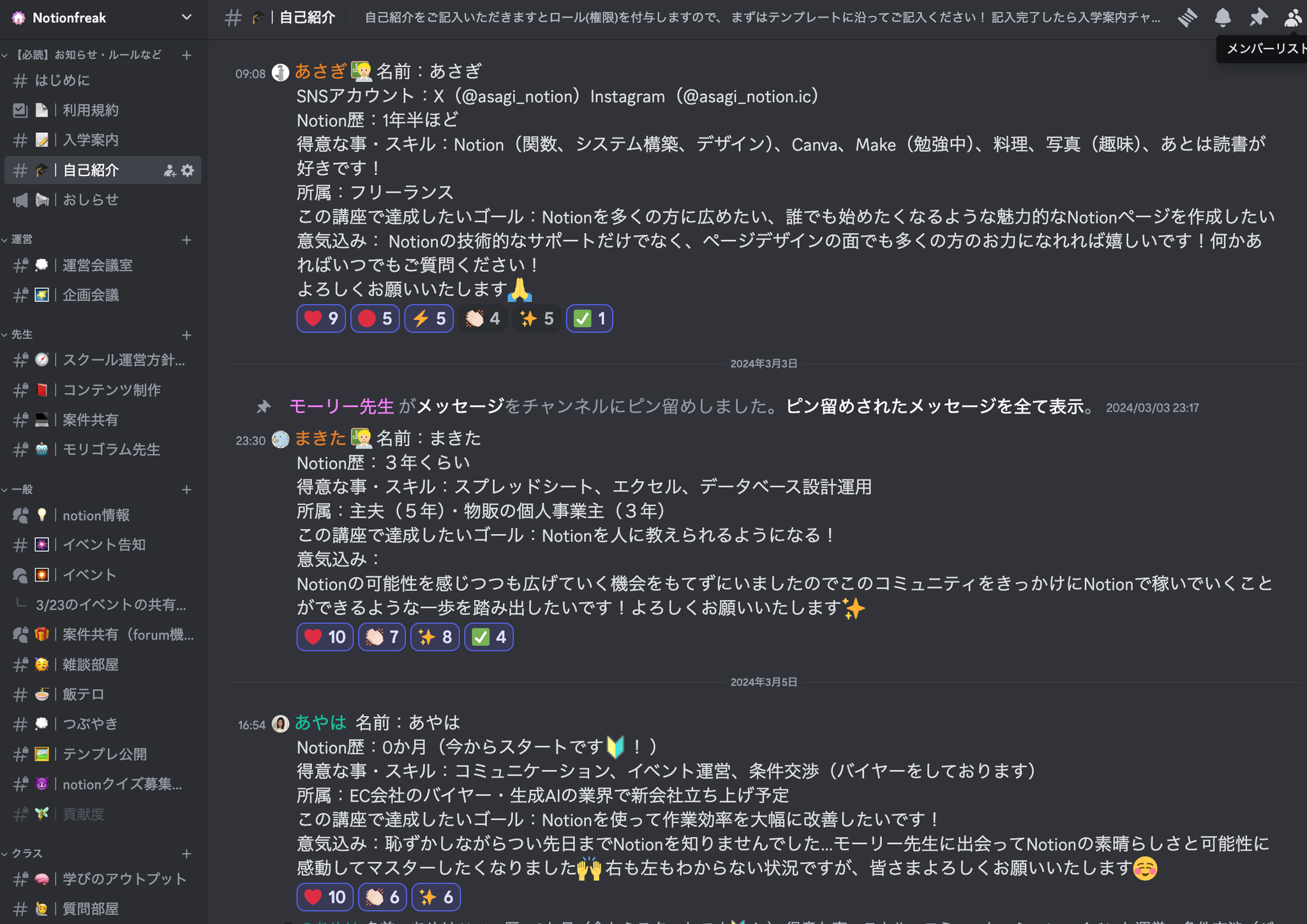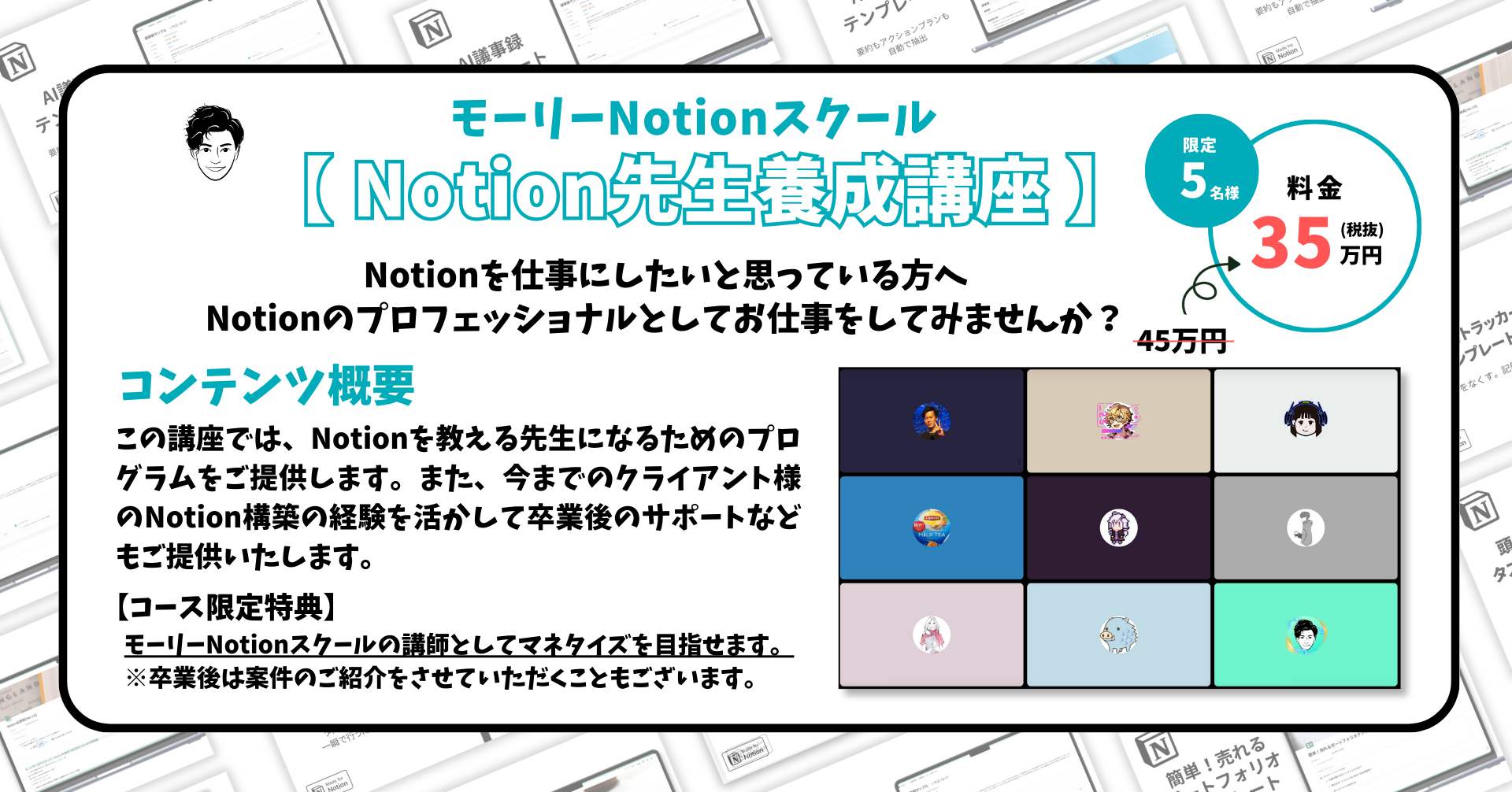| Notion先生養成講座 | 全8回 1回2時間 | モーリーが直接Notionコーチになるために必要な知識を教え込みます。 案件のご紹介がある場合もあります。 | 決済リンク | |