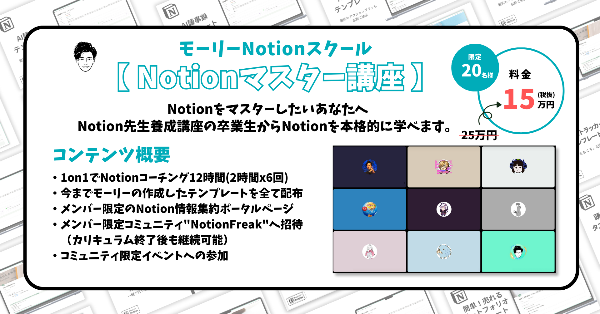| Notionマスター講座 (モーリー監修のもと、Notion公認資格を持つNotion講師がメンターになります。) | 全6回 1回2時間 | 初心者からでも全12時間でNotionを自在に操れる ”マスター”レベルまで引き上げます。 | 決済リンク | |