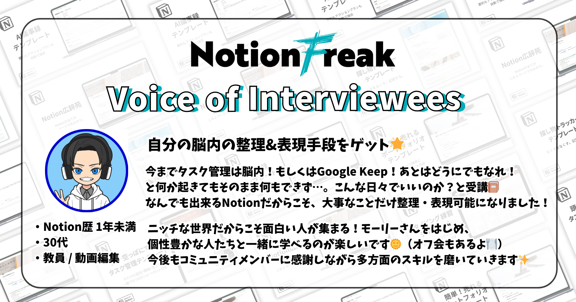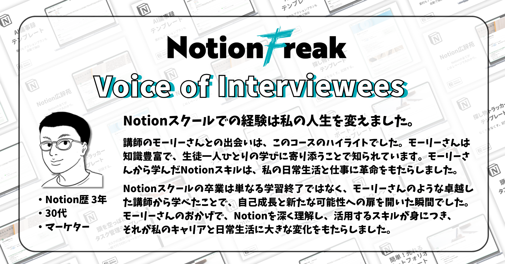 👨💬「Notionコンサルティングサポートを利用して、業務効率が大幅に向上しました。モーリーさんの分かりやすく的確なアドバイスとサポートがとても安心できました。おすすめです!」