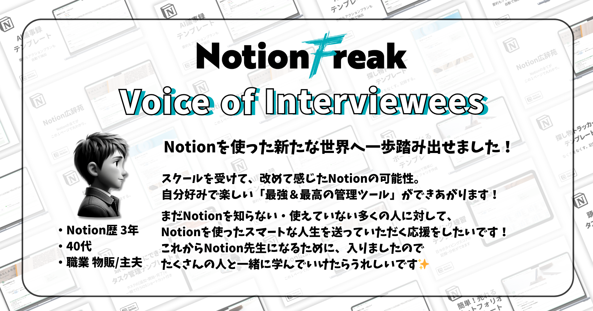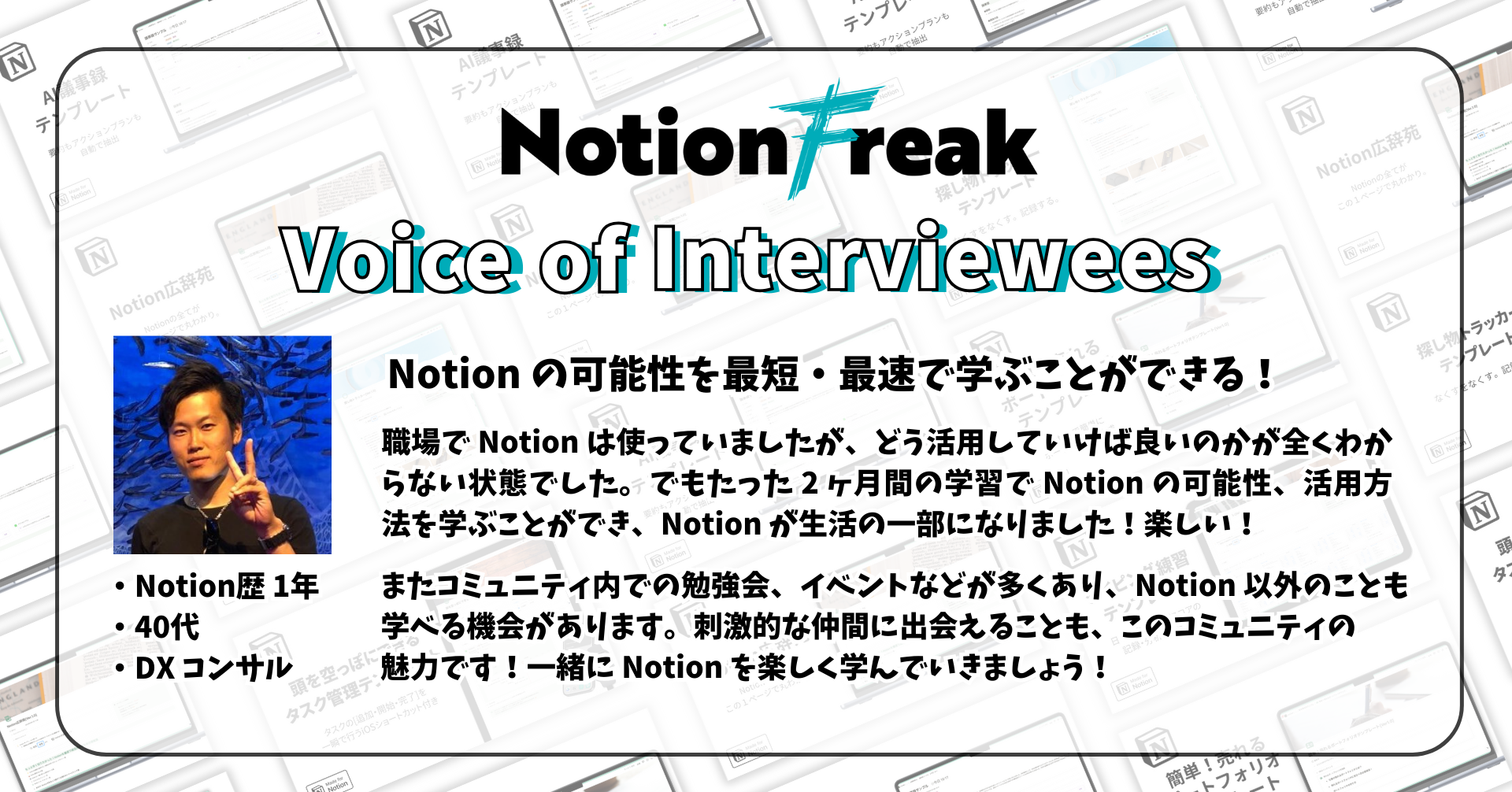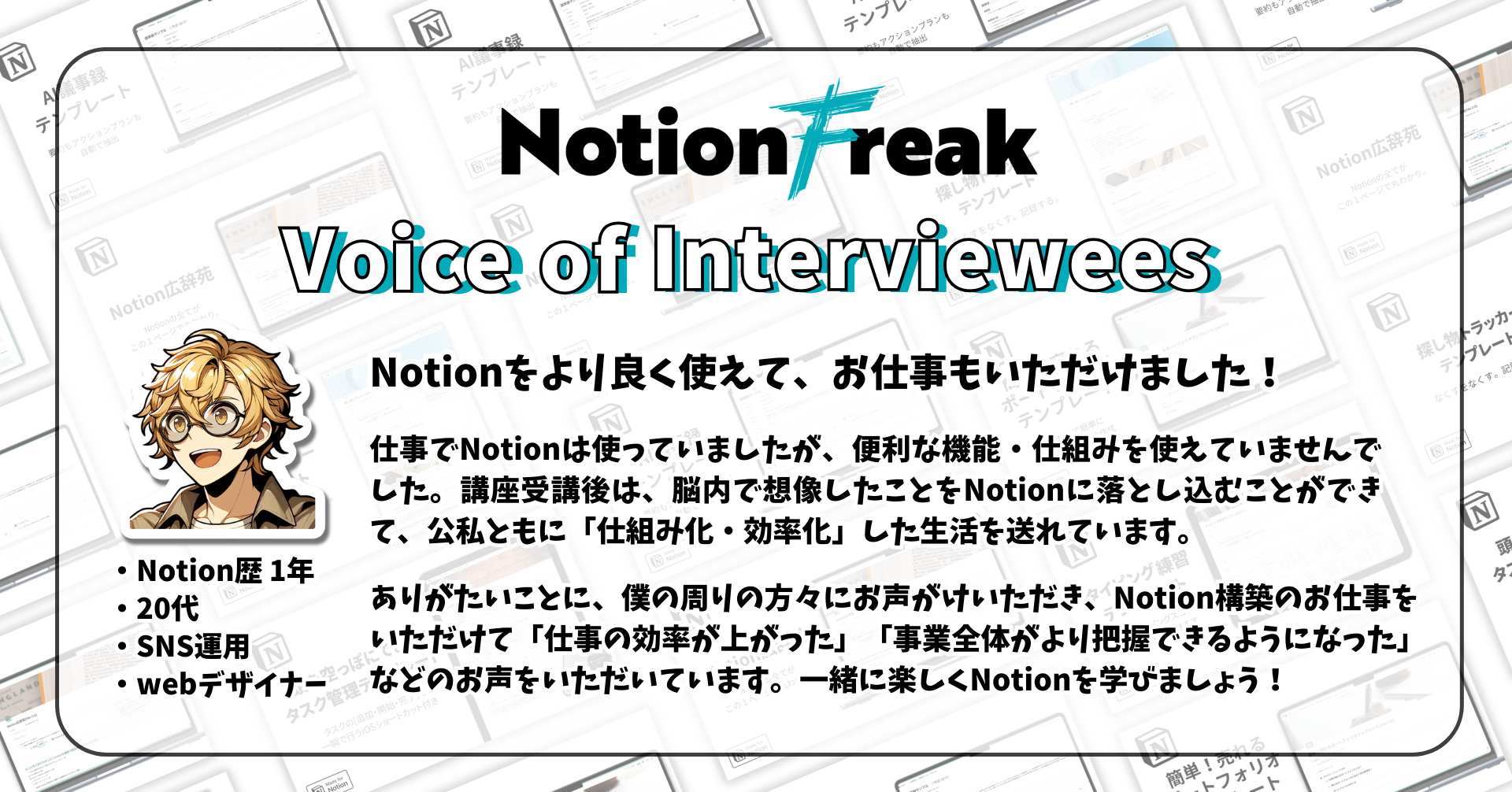 👨💬「Notionの法人顧問サポートを受けて、チーム内の情報共有がスムーズになりました。圧倒的に業務効率が上がり、無駄な作業をなくすことができました!」