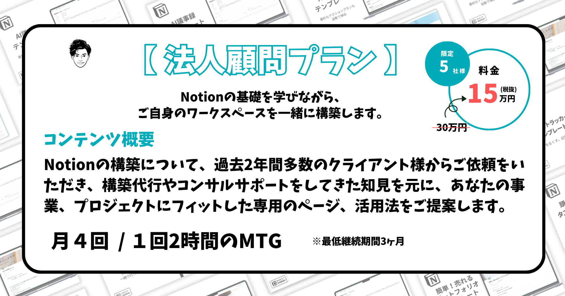 | 【法人向け】 Notion顧問プラン [※最低継続期間3ヶ月] | 月4回 1回2時間 | ※先着5社様限定 伴奏型でNotionワークスペースを構築、ブラッシュアップしていきます。 | 決済リンク |