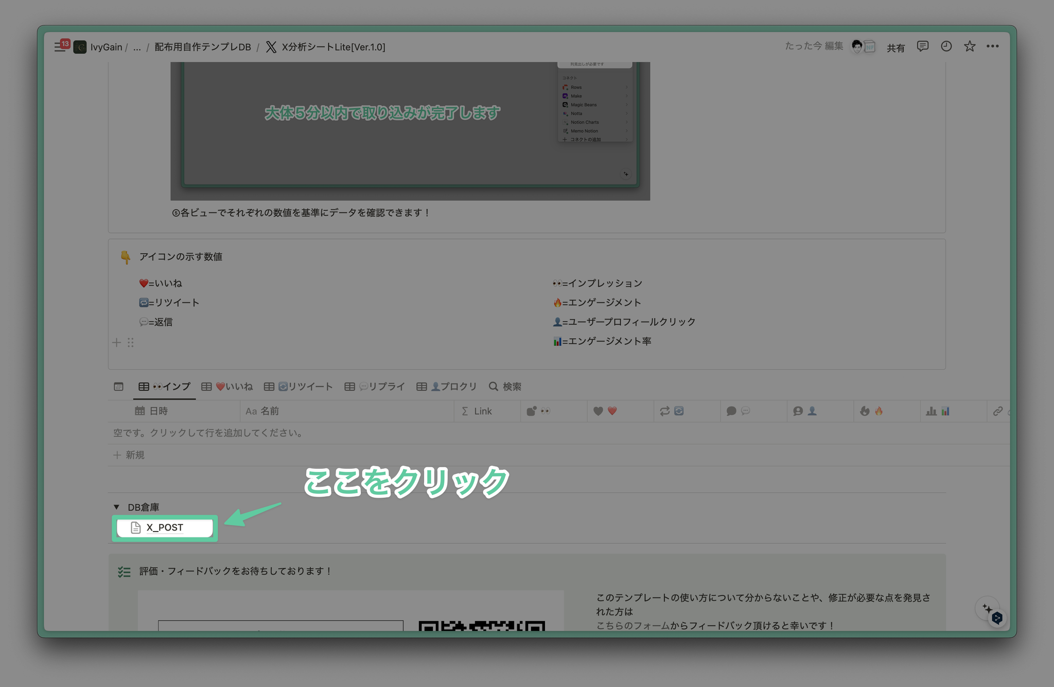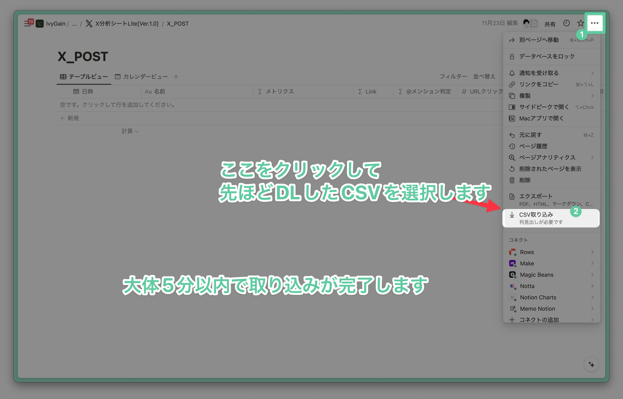 ③ ”②”の操作でCSVファイルをダウンロードできたら、このNotionページに戻ります。