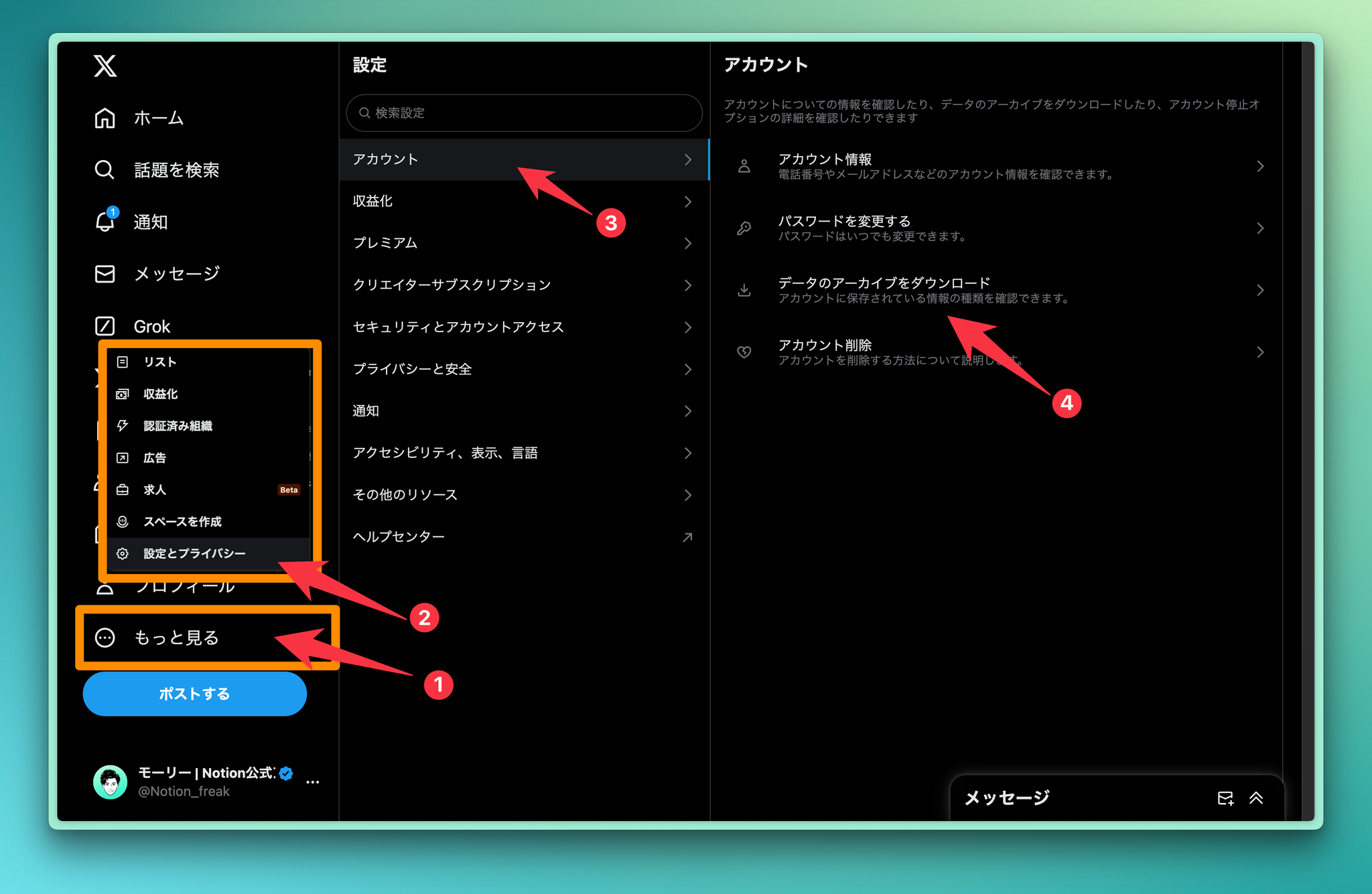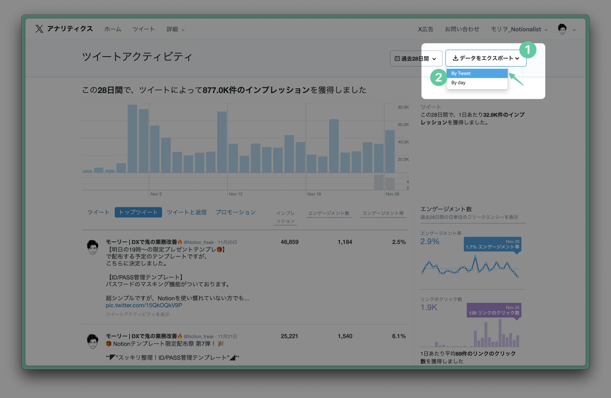 ②Xアナリティクスページに無事に入ったら右上のデータをエクスポートからBy Tweetをクリックしてください。