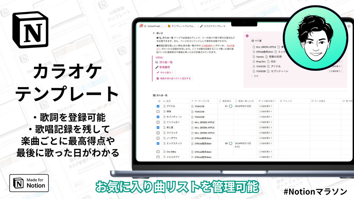 ページでは楽曲のアレンジ、キーの高さや歌う時の注意点などを記録できます。また、ページのコンテンツとして歌詞を収録できます。