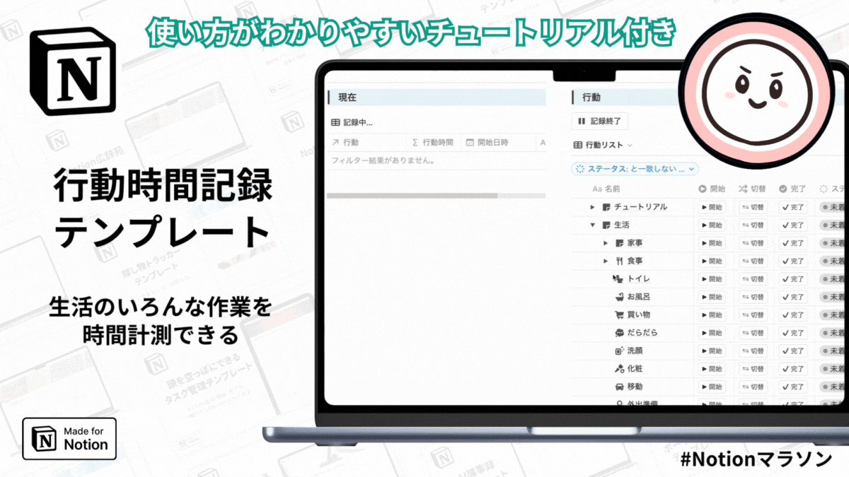 ボタン機能で簡単に行動を記録できるタイムトラッキングテンプレートです。